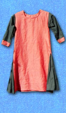 Kinderkleid aus rotem Leinen mit naturfarbenen Keilen und Ornamentborte.